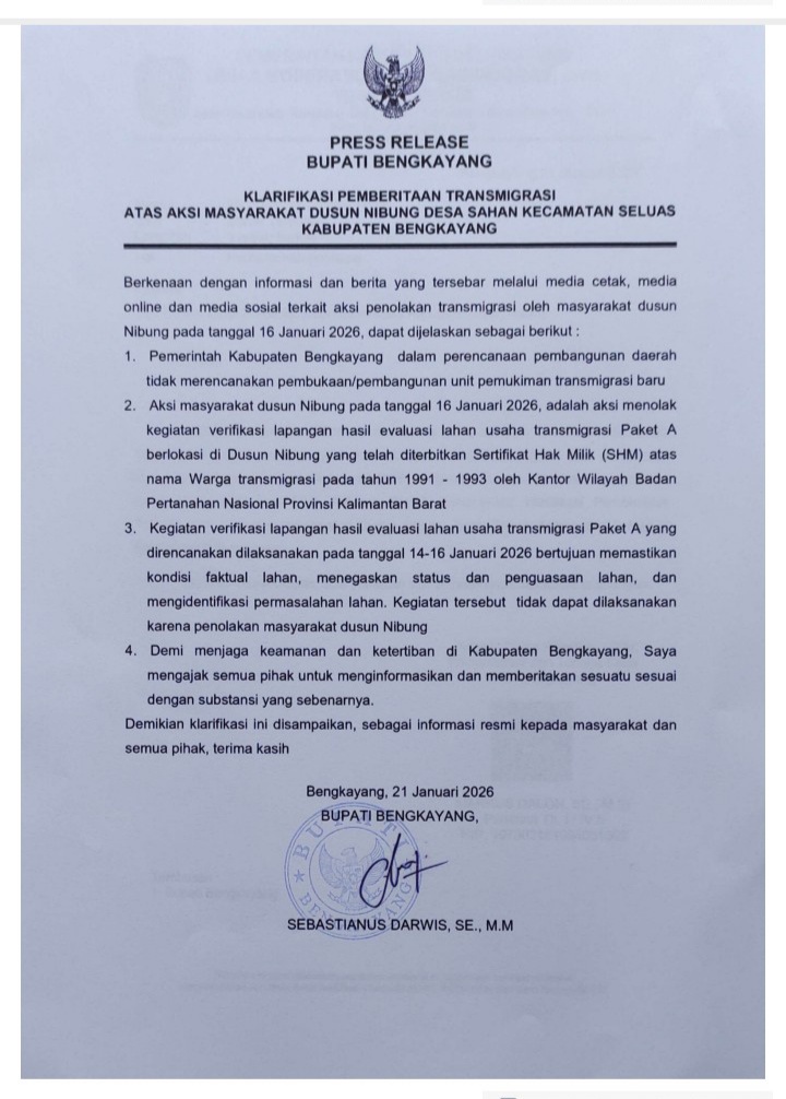 Bupati Bengkayang Klarifikasi Isu Transmigrasi Atas Aksi Warga Dusun Nibung, Desa Sahan Selengkapnya » 22 January 2026